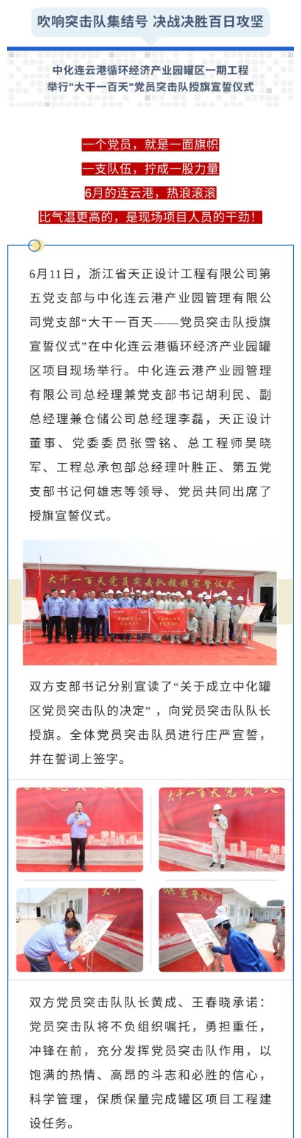 吹响突击队集结号 决战决胜百日攻坚——中化连云港循环经济产业园罐区一期工程举行"大干一百天"党员突击队授旗宣誓仪式